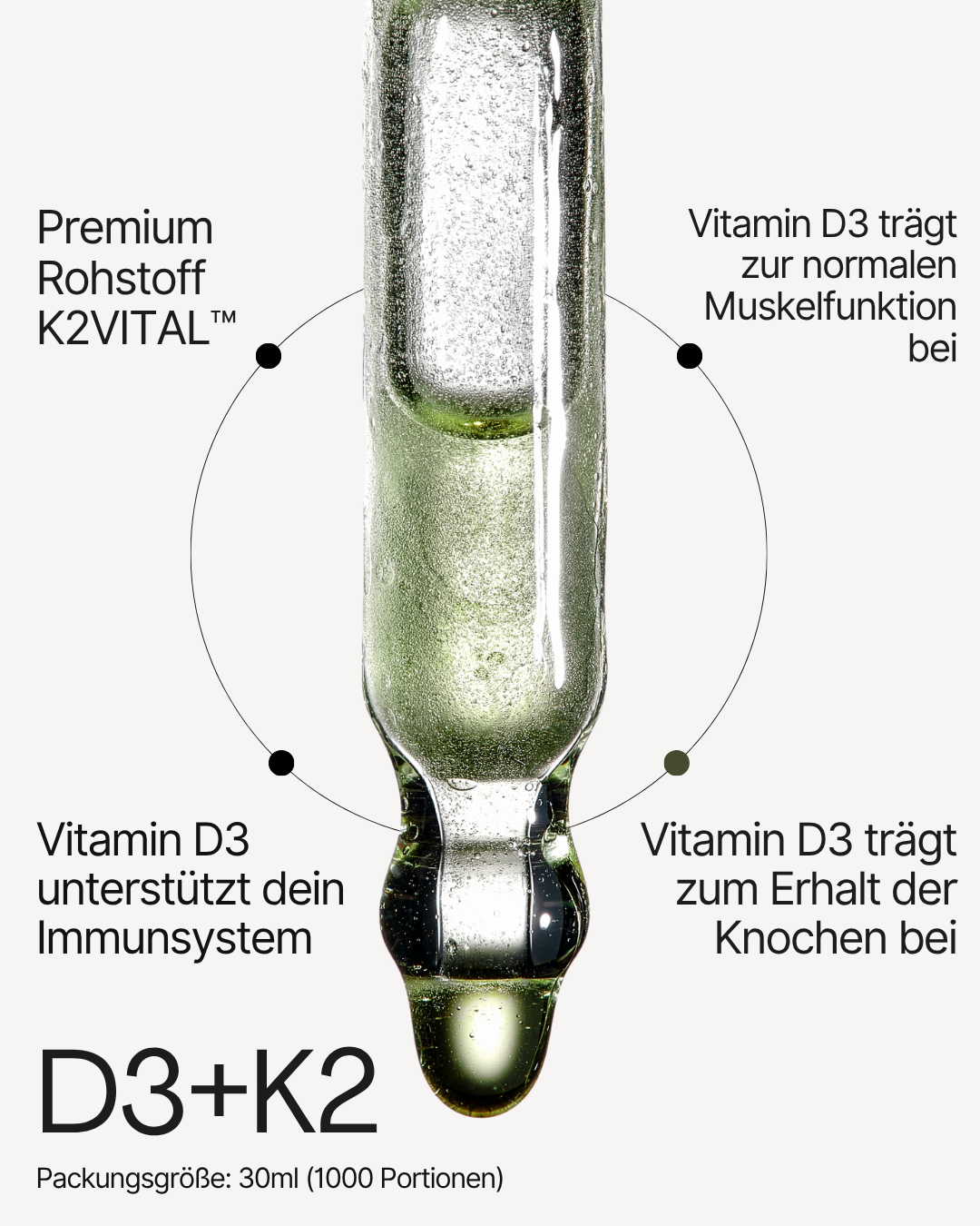 Unsere D3+K2 Tropfen liefern dir hochreines Vitamin D3 in Kombination mit dem Premium-Rohstoff K2VITAL™ – für maximale Aufnahme und Wirkung. 30ml (1000 Portionen)