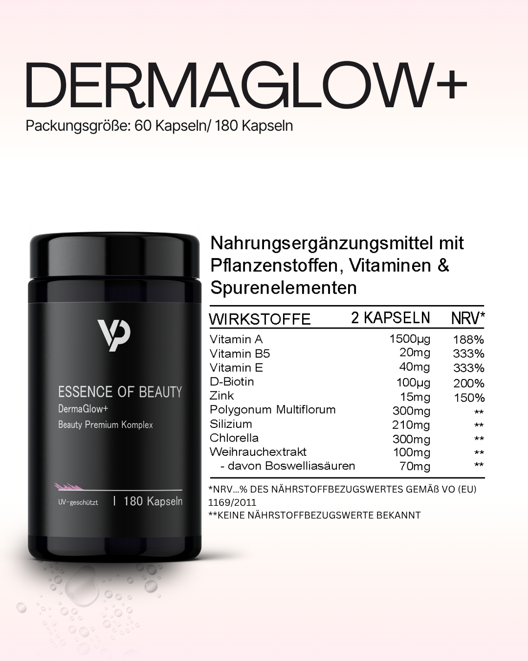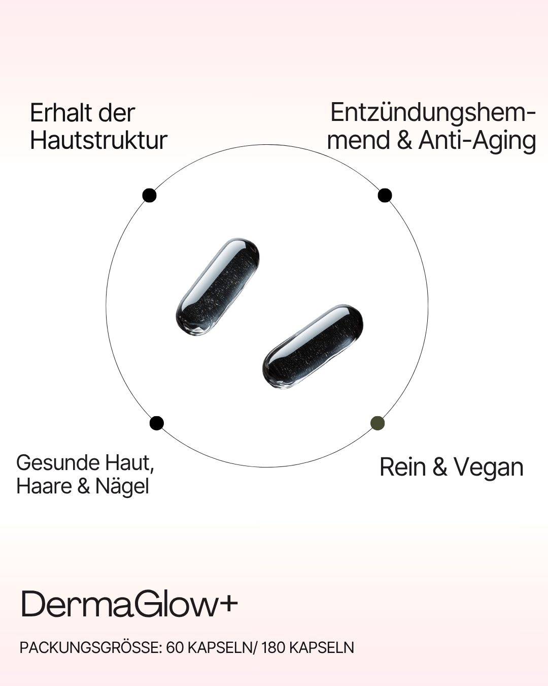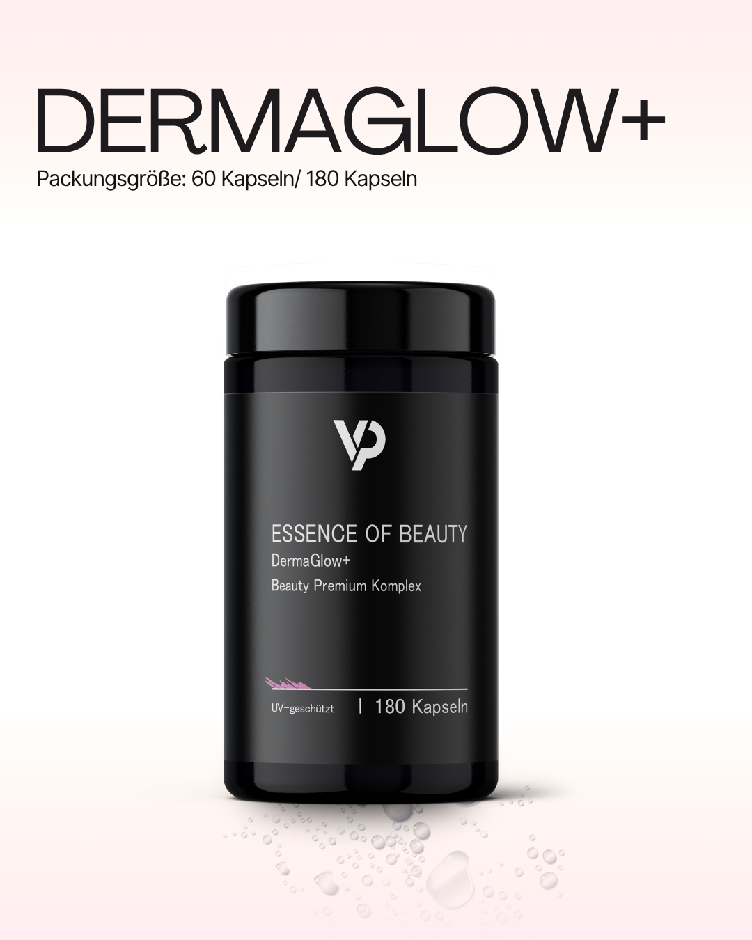 Entdecke mit Derma Glow+ natürliche Schönheit von innen. Unsere Formel vereint essentielle Vitamine, Mineralstoffe und Pflanzenextrakte, die deine Haut, Haare und Nägel unterstützen. Für ein gesundes, strahlendes Erscheinungsbild.