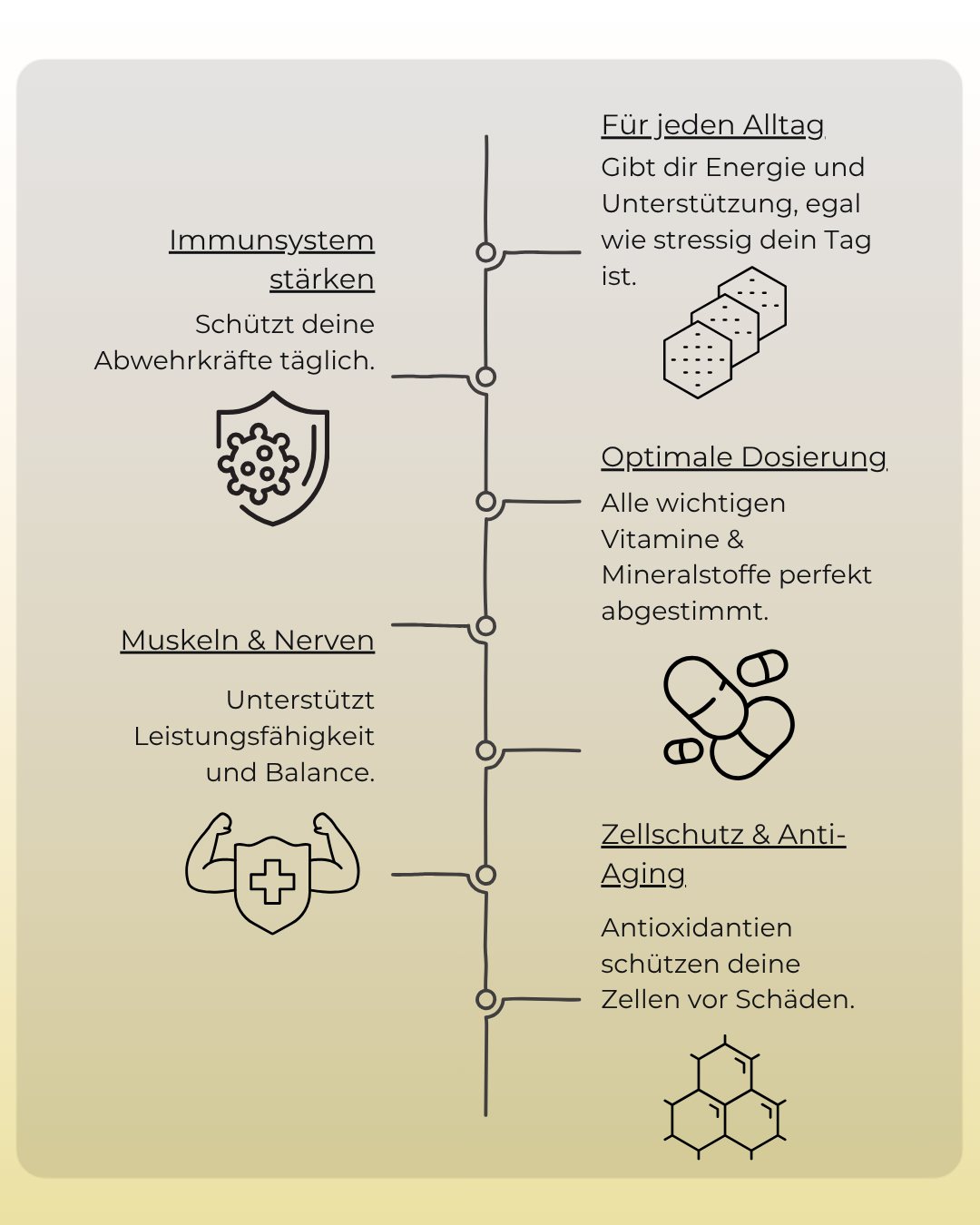 Deine tägliche Komplettversorgung auf Premium-Niveau – für Energie, Immunsystem & Zellschutz.