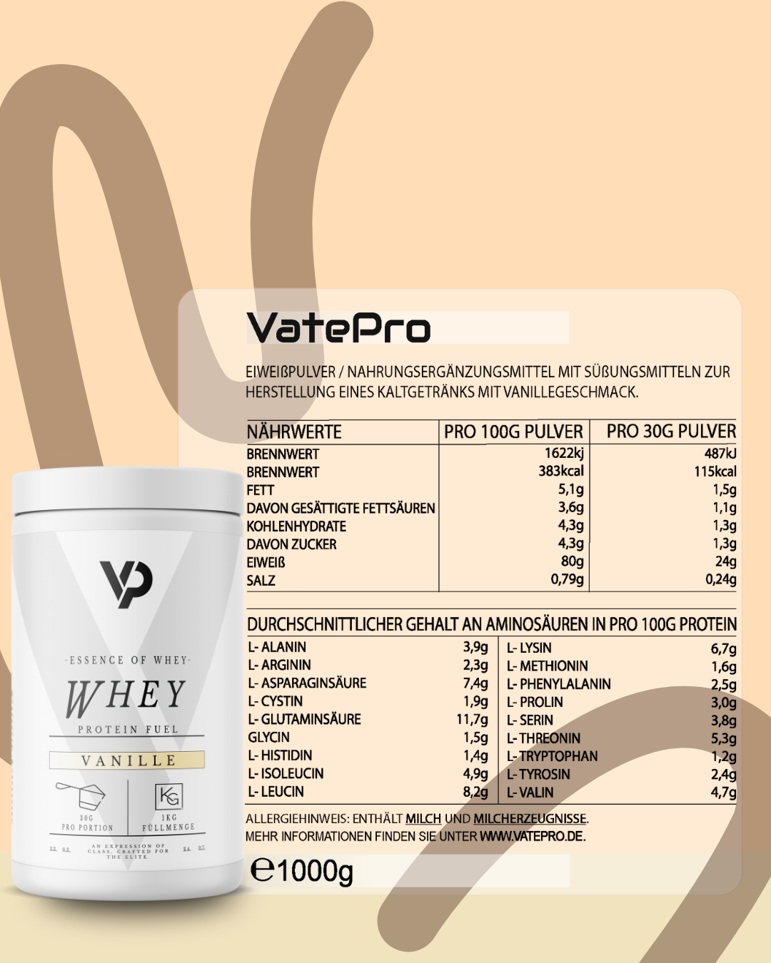 Unser Whey Protein in der Geschmacksrichtung Vanille vereint vollen Genuss mit bester Nährstoffqualität. Die Kombination aus Whey-Konzentrat und Whey-Isolat sorgt für eine ausgezeichnete Eiweißversorgung